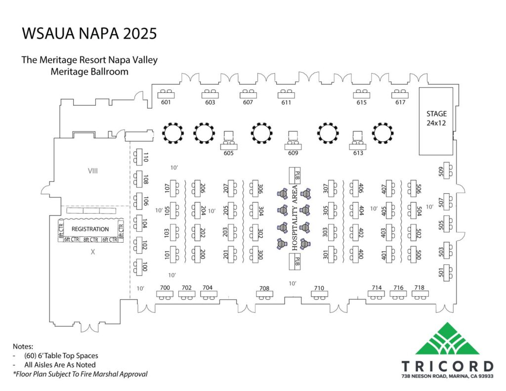 The exhibit area includes the Meritage Ballroom and Promenade areas and is a short walk to the Carneros Ballroom where the sessions are held. All displays will be table-top style in that there will be no pipe and drape used between spaces at the show, except where indicated. Booth price includes identification sign, two chairs, one 6' draped table, standard power and waste basket.